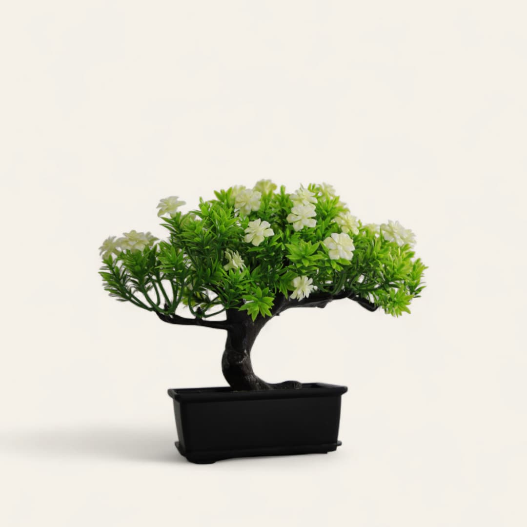 Bonsái pequeño artificial de ciprés en una maceta negra