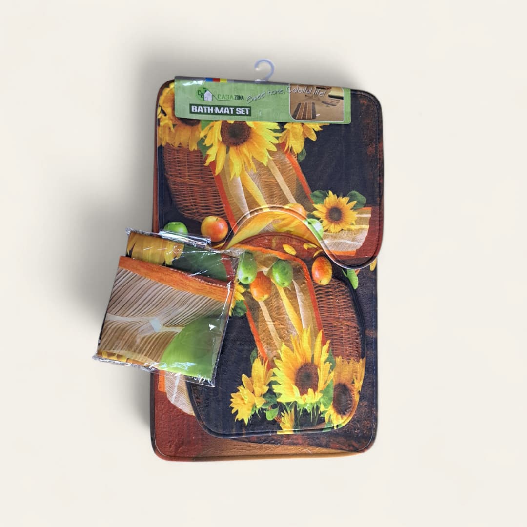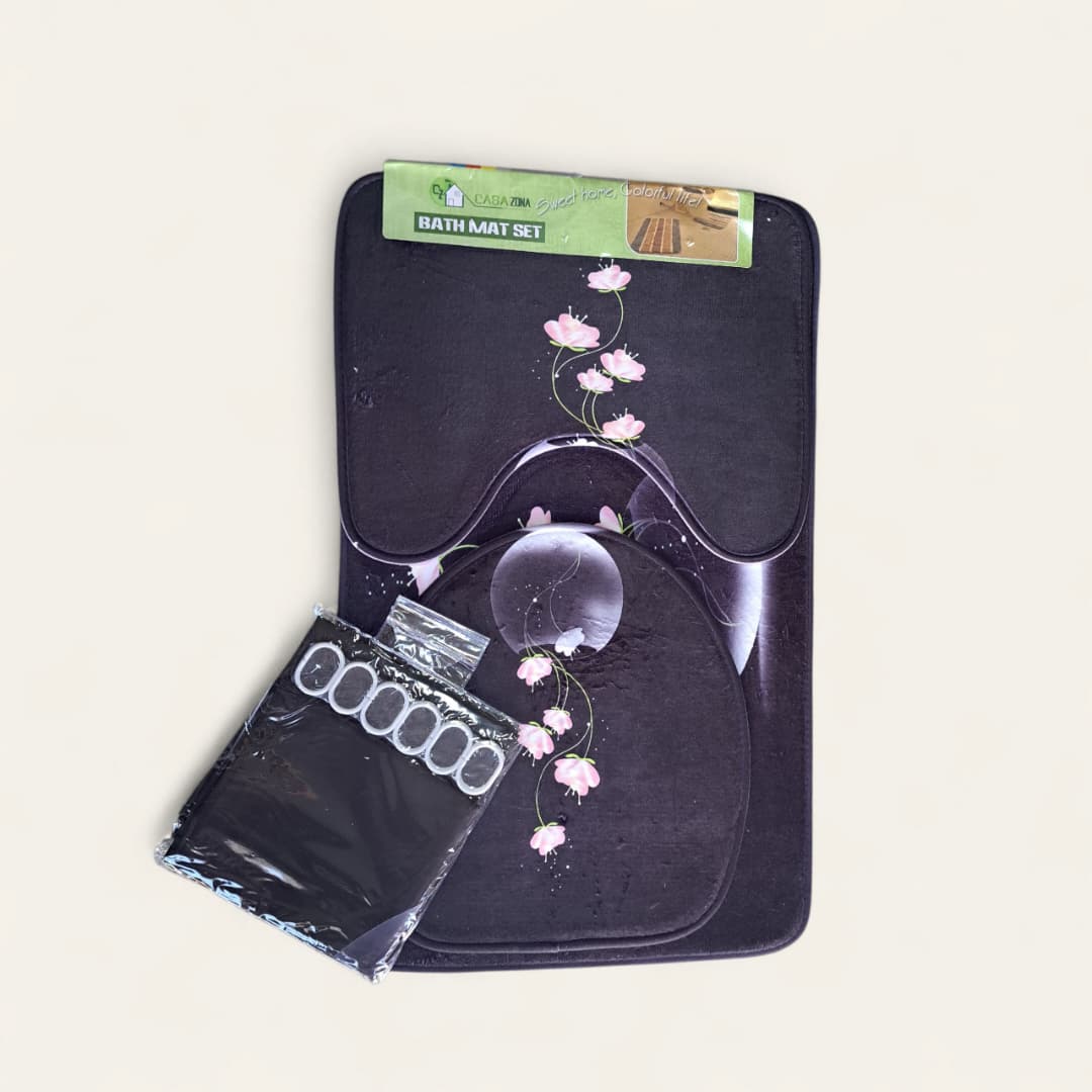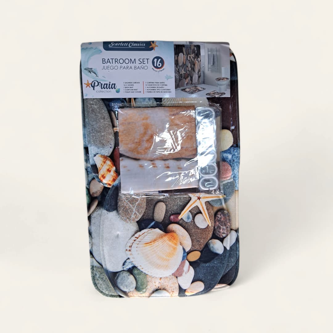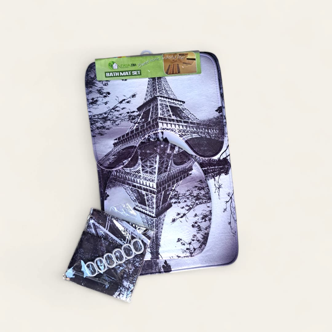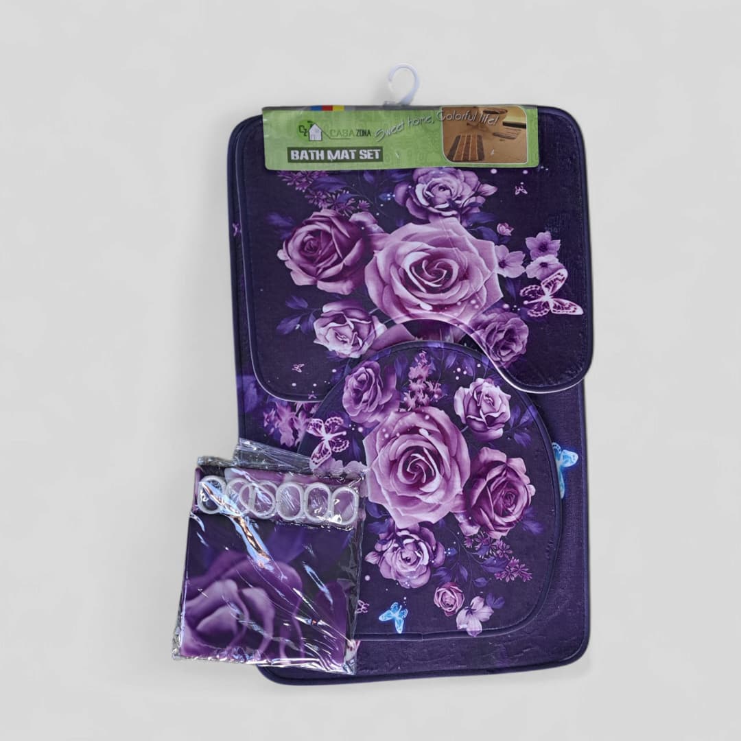 Juego de alfombras de baño, incluye, aros para cortina, alfombra para tapa de taza, alfombra para taza de baño, alfombra para entrada del baño.