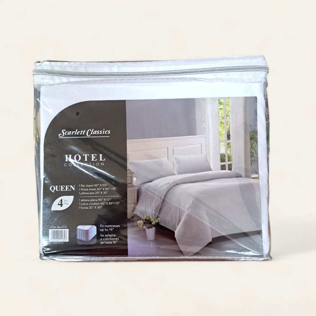 Juego de sábanas, de la colección «Hotel», diseñado para una cama de tamaño queen. El juego incluye cuatro piezas: una sábana plana, una sábana ajustable y dos fundas de almohada.