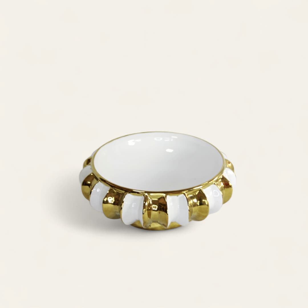 Plato decorativo de cerámica acanalado en blanco y dorado.