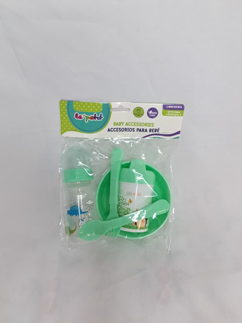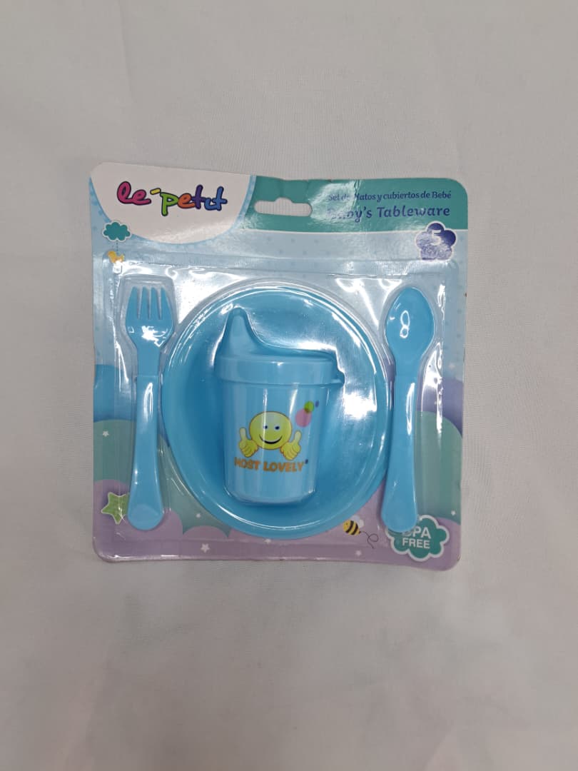 Juego de vajilla para bebés. Incluye un plato, un tenedor, una cuchara y un vaso con tapa.